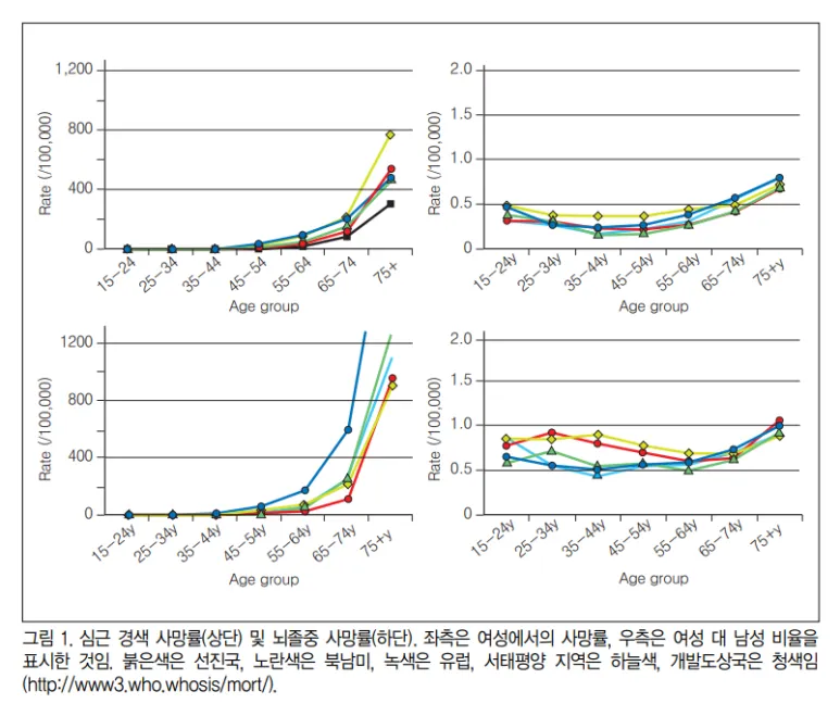국민건강보험 자료를 보더라도 60대 이상이 되면 여성의 심혈관질환 환자 비율이 남자보다 많아지고, 80세 이상의 연령에서는 여성이 남성의 3배에 달합니다. 그 뿐 아니라 고혈압, 고지혈증, 당뇨병, 비만 등 심혈관질환의 위험요인 등도 급격히 증가하기 때문에 적절한 건강관리 요령이 필요합니다.