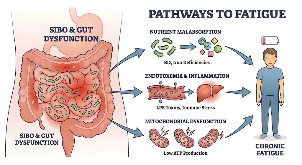 비타민 B12와 철분 결핍: 세균은 생존을 위해 비타민 B12와 철분을 집중적으로 소모합니다. 이는 적혈구 생성을 방해하여 미세한 빈혈을 유발하고, 전신 조직으로 가는 산소 공급량을 떨어뜨려 만성적인 저산소성 피로를 유발합니다.