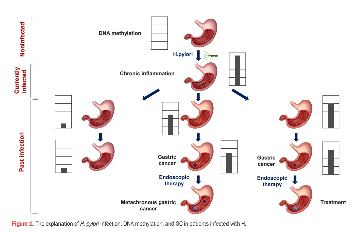 위의 그림은 헬리코박터 파일로리 감염 여부와 DNA 메틸화(유전자 스위치 꺼짐), 그리고 위암 발생 사이의 관계를 한눈에 보여줍니다.