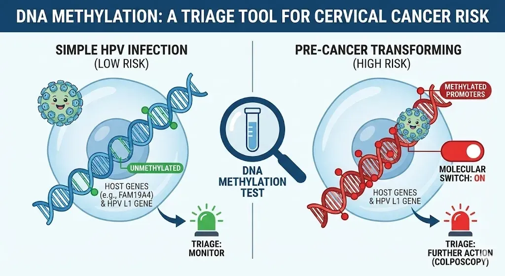 하지만 메틸화 연구 결과는 '분자적 스위치(Molecular Switch)' 모델을 지지합니다 . 즉, HPV 감염 후 저등급 병변을 거치지 않고 곧바로 고등급 병변(CIN3)으로 "스위치가 켜지듯" 진행될 수 있으며, 이때 DNA 메틸화 패턴이 급격히 변화한다는 것입니다. 메틸화 검사는 이러한 '위험한 스위치'가 켜졌는지를 감지하는 핵심 도구가 될 수 있습니다.
