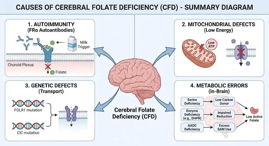 오늘 글은 뇌 엽산 결핍(CFD)을 유발하는 다양한 메커니즘을 정리해보려 합니다. 크게 자가면역성 원인, 미토콘드리아 결함, 유전적 결함, 그리고 대사 이상으로 나눌 수 있습니다.