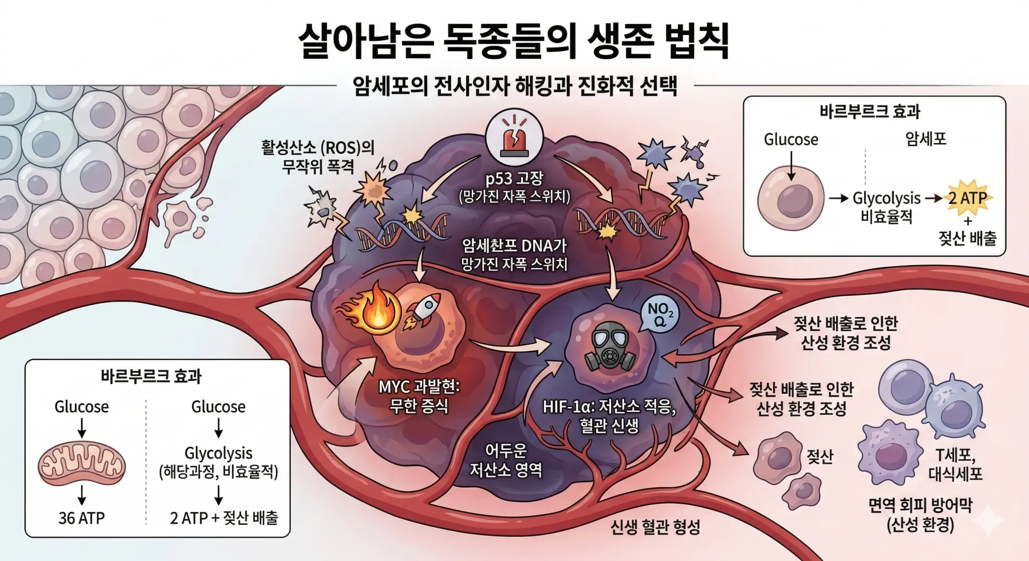 좀비가 된 세포들은 척박한 환경 속에서 무작위적인 돌연변이를 거듭합니다. 수많은 불량 세포들이 굶어 죽고 터져 죽는 가운데, 오직 특정 스위치를 우연히 켜는 데 성공한 놈들만이 살아남아 군집을 이룹니다. 그것이 바로 우리가 아는 '암 덩어리'입니다.