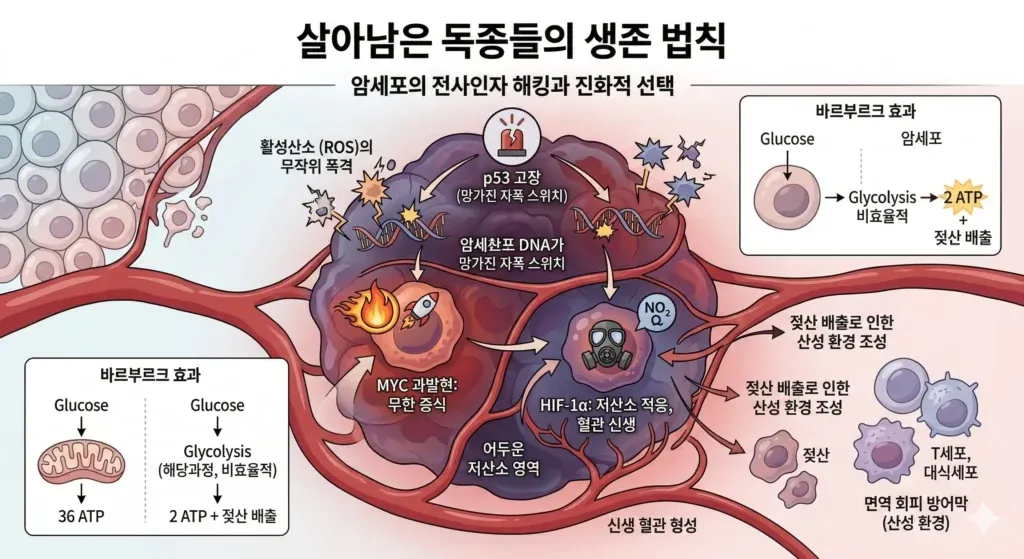 산소 없이 숨을 참는 기괴한 대사 (바르부르크 효과 & HIF-1α): 암 덩어리 내부는 산소가 부족합니다. 살아남은 독종들은 HIF-1α 스위치를 켜서 새로운 혈관을 억지로 끌어오고, 산소 없이 포도당을 불완전 연소시킵니다.