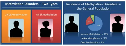 자폐스펙트럼장애와 다양한 정동장애의 원인으로 메틸레이션 장애가 있으며, 과메틸화와 저메틸화의 차이에 따라 신경전달물질의 활성에 영향을 미치는 다양한 영양 성분이 치료에 중요한 역할을 할 수 있습니다.