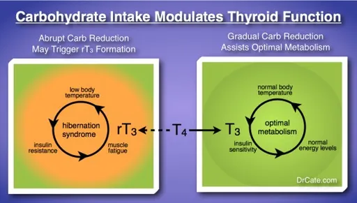 저탄수화물 및 케토식단은 갑상선에 긍정적일 수도, 부정적일 수도 있으며, 특히 갑상선 기능저하증이나 Hashimoto병 환자에게 주의가 필요하다. 저탄수화물 식단이 T3 감소, rT3 증가, 부신 호르몬의 불균형을 초래할 수 있어, 이러한 상태에서는 탄수화물 섭취를 조절하고, 개인의 건강 상태에 맞게 식단을 조정하는 것이 중요하다. 또한, 스트레스 관리와 수면 질 확보가 필수적이다.